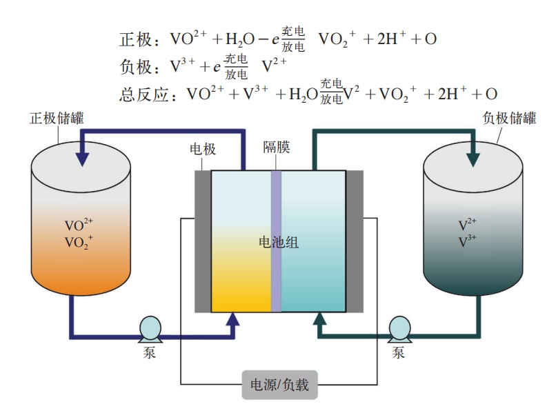 釩電池利用VO2+/VO2+、V2+/V3+兩對(duì)氧化還原電堆的釩離子溶液作為正極和負(fù)極的活性物質(zhì),分別儲(chǔ)存在各自的電解液儲(chǔ)罐中。對(duì)電池進(jìn)行充/放電時(shí),電解液通過泵的作用,由外部儲(chǔ)液罐分別循環(huán)流經(jīng)電池的正極室和負(fù)極室,并在電極表面發(fā)生氧化和還原反應(yīng),實(shí)現(xiàn)對(duì)電池的充/放電。